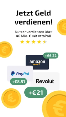Möchten Sie Ihre freie Zeit sinnvoll nutzen und gleichzeitig Ihr Bankkonto aufbessern? AttaPoll ist Ihre smarte Begleitung, um mühelos und flexibel zusätzliches Einkommen zu generieren. Verwandeln Sie Ihre Perspektiven in Bares und genießen Sie spielerische Unterhaltung, die sich auszahlt – alles direkt über Ihr Smartphone, wo immer Sie gerade sind. AttaPoll verbindet Sie mit einem Universum an Möglichkeiten, um Ihre Meinung zu teilen und für Ihr Engagement belohnt zu werden, und ist damit die ideale Lösung für alle, die unterwegs oder zu Hause mit minimalem Aufwand Gewinne erzielen möchten.