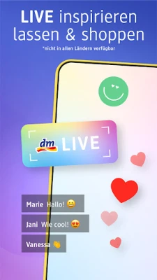 Die dm-App ermöglicht Ihnen zudem eine nahtlose Verbindung zu Ihrer bevorzugten Filiale. Finden Sie schnell dm-Märkte in Ihrer Nähe, überprüfen Sie die aktuelle Produktverfügbarkeit und nutzen Sie die praktische Express-Abholung für Ihre Online-Bestellungen. Werden Sie Teil unserer Community bei dmLIVE, wo Sie exklusiven Zugang zu interaktiven Shows erhalten – voller Inspiration, Expertenberatung und spannender Pre-Launches. Abgerundet wird Ihr individuelles Erlebnis durch personalisierte Empfehlungen, die genau auf Ihre Interessen zugeschnitten sind, sowie sichere und flexible Bezahloptionen. Ihre Meinung ist uns wichtig: Die dm-App entwickelt sich stetig weiter und freut sich auf Ihr wertvolles Feedback.