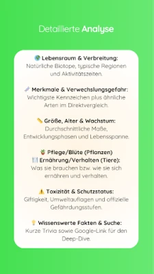 Planen Sie Ihre Naturbeobachtungen mit dem integrierten Saisonkalender, der Ihnen Blütezeiten oder Vogelwanderungen anzeigt. Die App bietet zudem wichtige Sicherheitshinweise zu toxischen Pflanzen, allergenen Pollen oder gefährlichen Tieren, um Mensch und Tier zu schützen. Ergänzt wird all dies durch wissenswerte Fakten und direkte Recherchemöglichkeiten, die Ihr Wissen vertiefen. Die App ist intuitiv gestaltet, erfordert kein Vorwissen und funktioniert sogar offline mit gespeicherten Fotos, sobald Sie wieder online sind. Sie unterstützt mehrere Sprachen und garantiert den Schutz Ihrer Privatsphäre, indem Ihre Bilder nach der Analyse umgehend gelöscht werden.